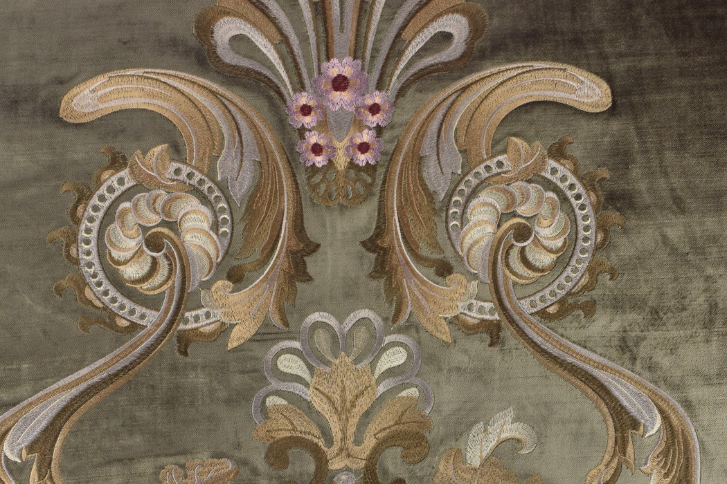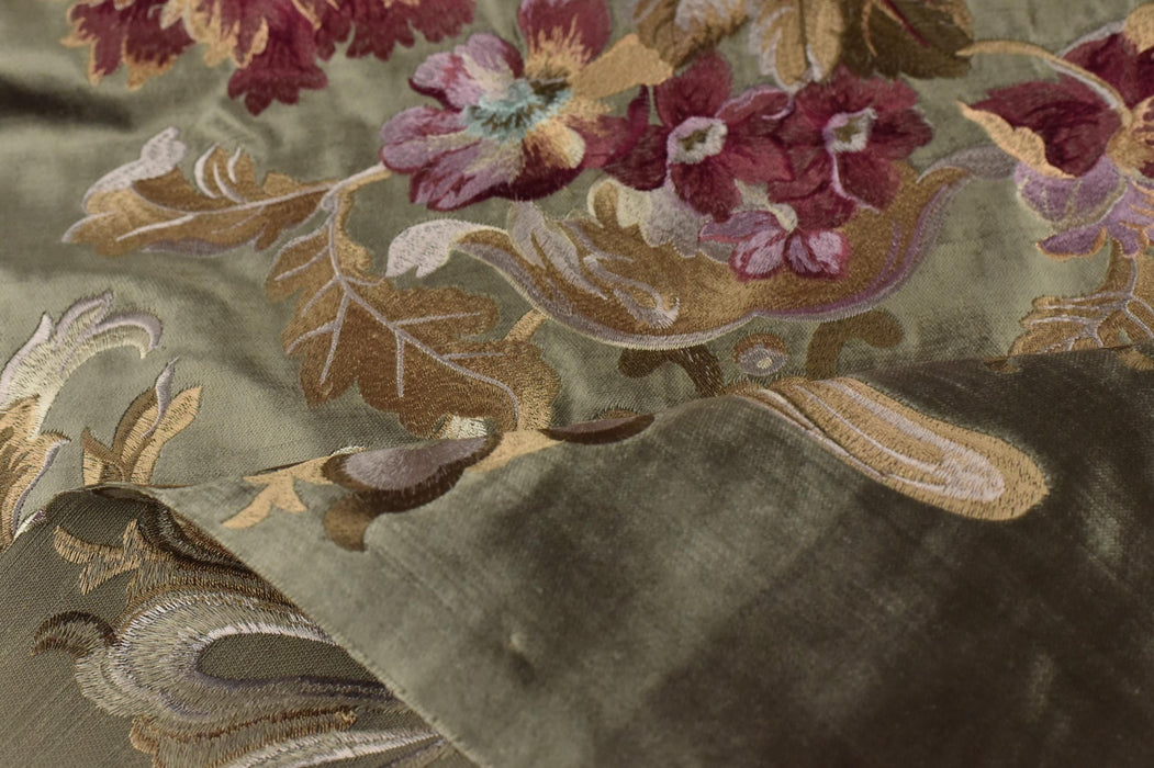 Indulge in the opulence of French-inspired design with this French Pinky Red and Gold Embroidered Large Floral on Dark Olive Green Cut Velvet Fabric. Featuring a rich dark olive green base and intricate pinky red and gold floral embroidery, this heavyweight fabric exudes timeless elegance and sophistication. Perfect for creating luxurious curtains, upholstery, or statement home decor, this fabric will elevate any space with its regal charm.