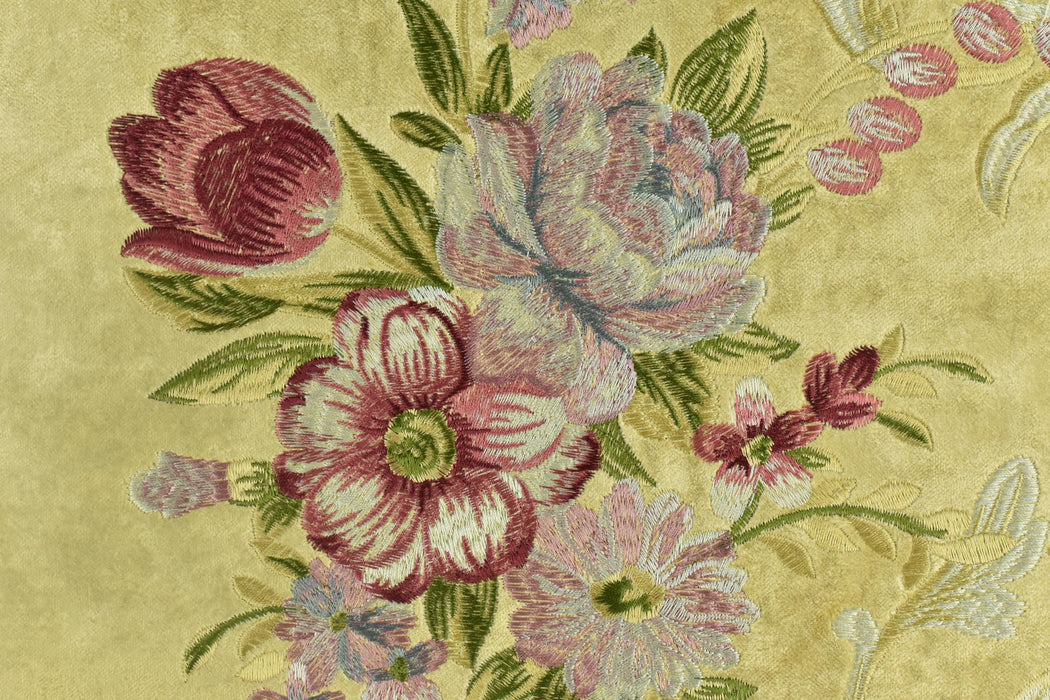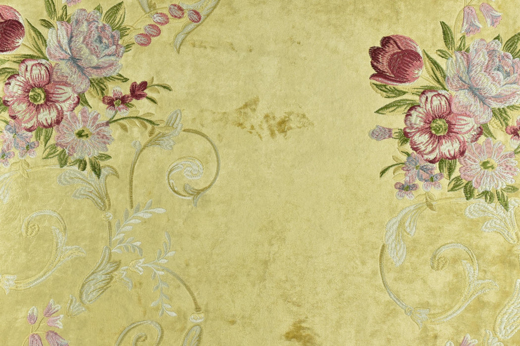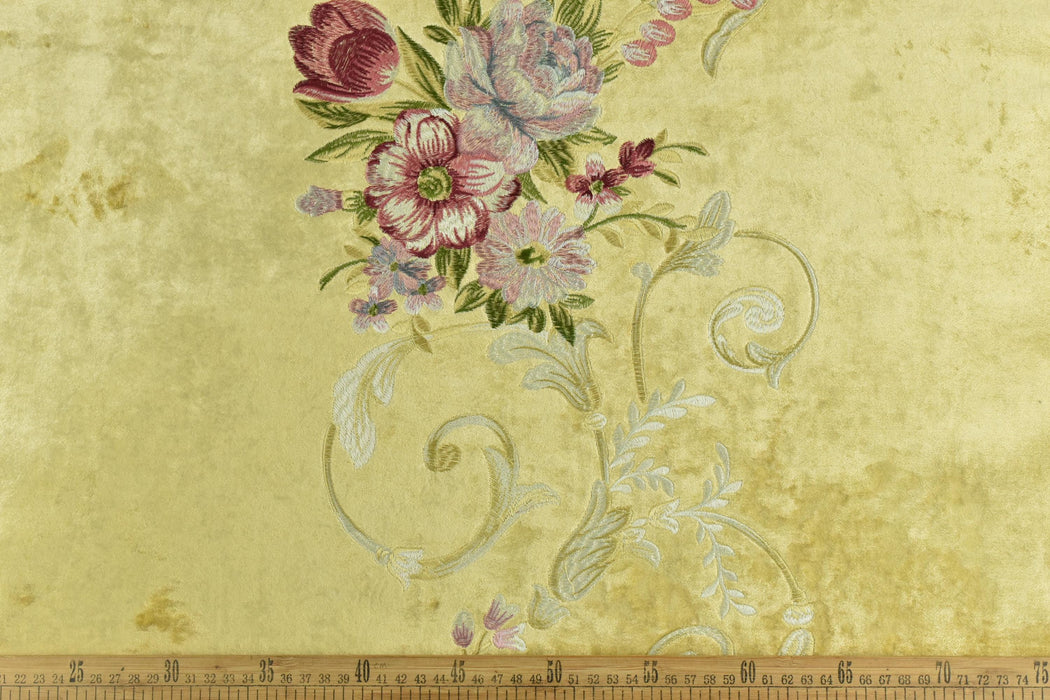 A sample is worth a thousand words! Recommend purchase a sample swatch prior to placing yards/meters.Wrap your home in romantic opulence with this luxurious heavyweight crushed velvet, featuring delicate heavy-embroidered red pink and green florals on a regal yellow ground. Perfect for creating timeless statement pieces, this fabric blends Parisian charm with modern durability for truly special interiors.