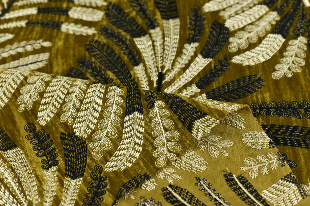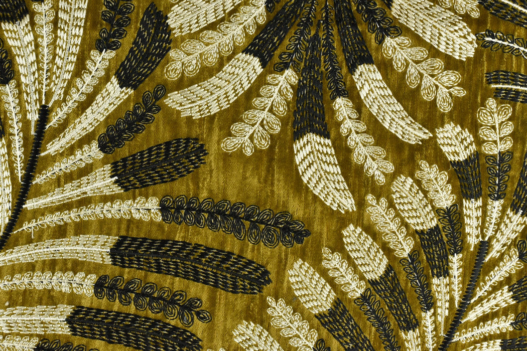 Designer Olive Gold Botanical Leaves Embroidered Floral Silky Velvet Fabric For Curtain|Luxury Tropical Home Decor Fabric For Drapery Pillow