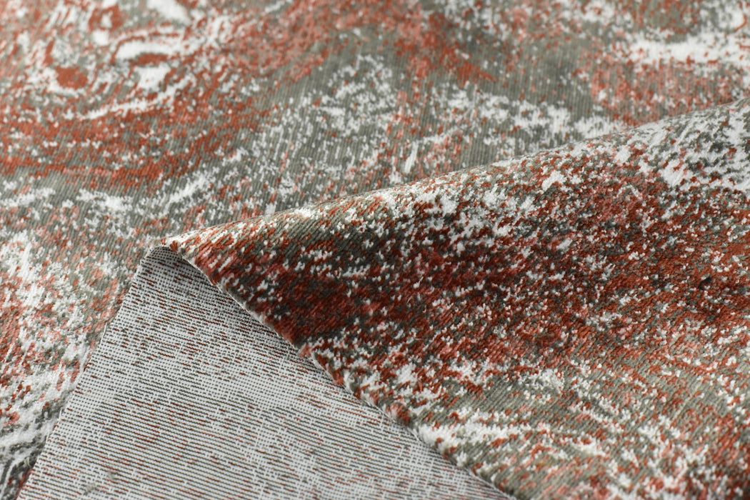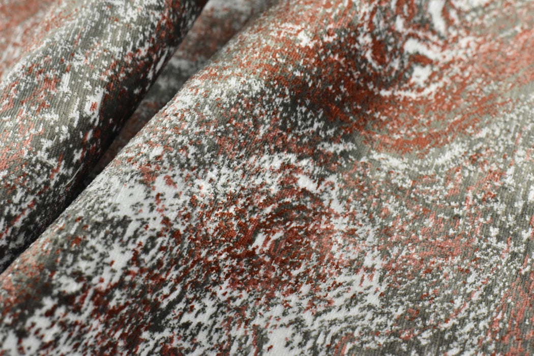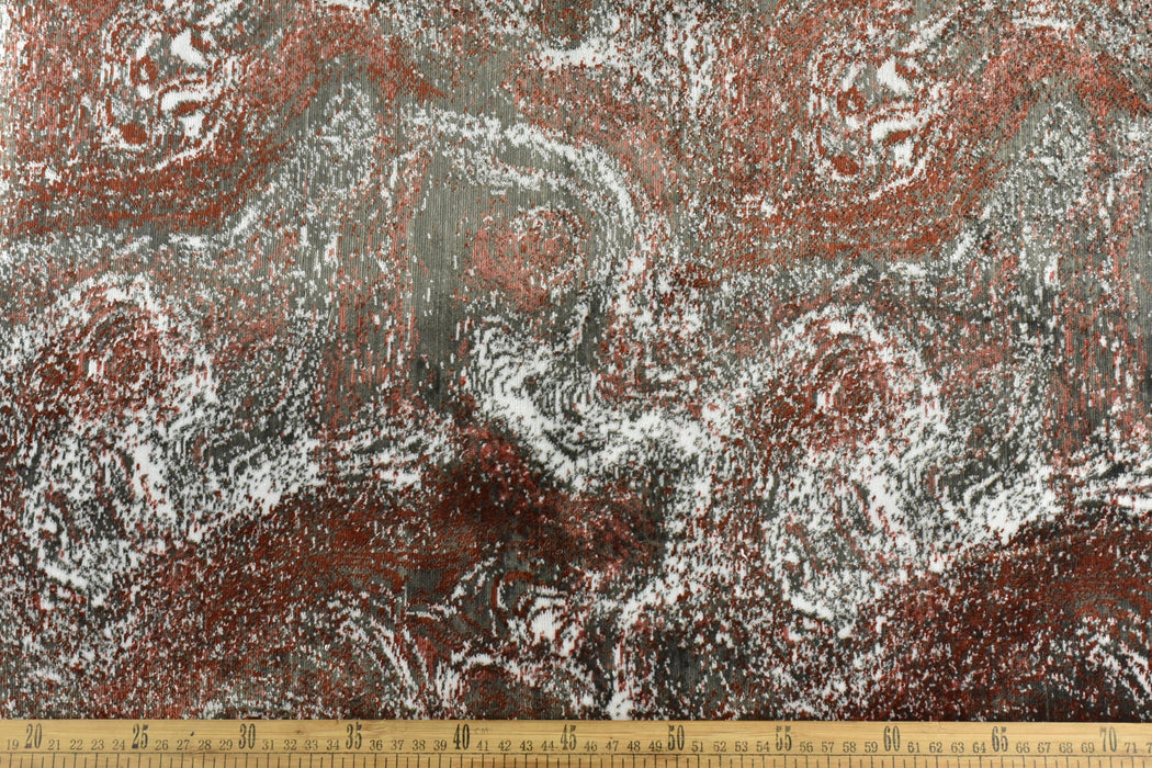 Crafted with precision, this cut velvet fabric features a rich, abstract design in a captivating blend of burnt orange, grey, and white tones. The intricate pattern adds depth and visual interest, making it ideal for statement pieces like accent chairs, sofas, throw pillows, ottomans, and headboards.