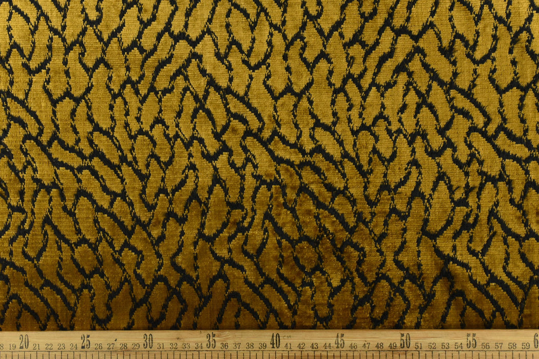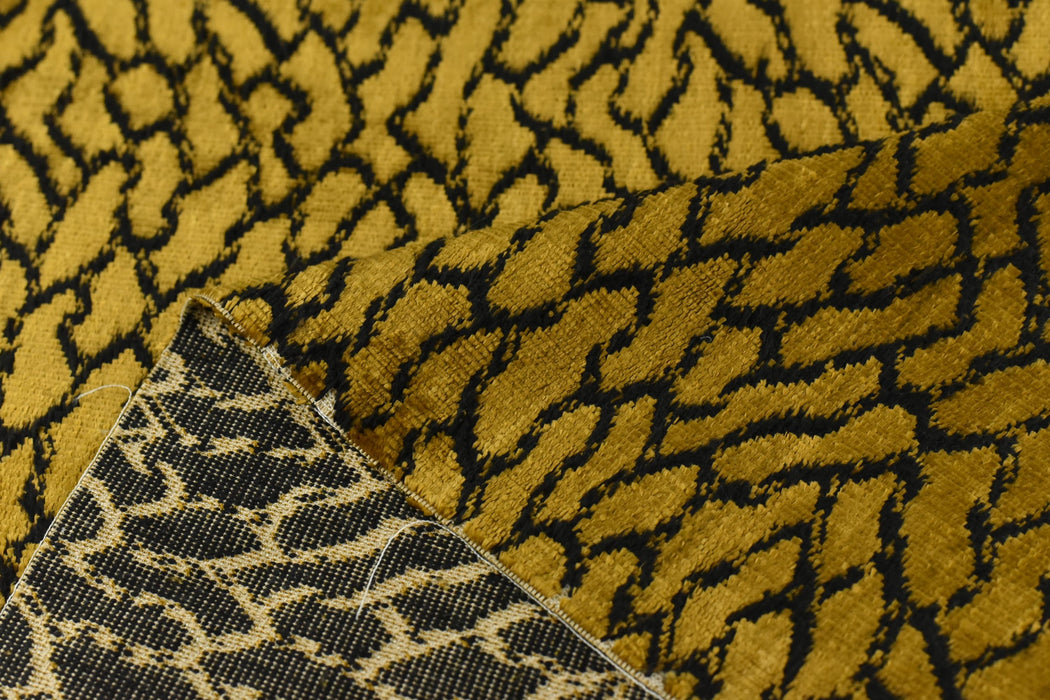 The bold abstract geometric pattern features rich metallic goldagainst black stripes, creating a striking contrast that adds depth and dimension to any space. The plush, heavyweight velvet texture not only feels luxurious to the touch but also ensures durability, making it ideal for both everyday use and statement furniture.