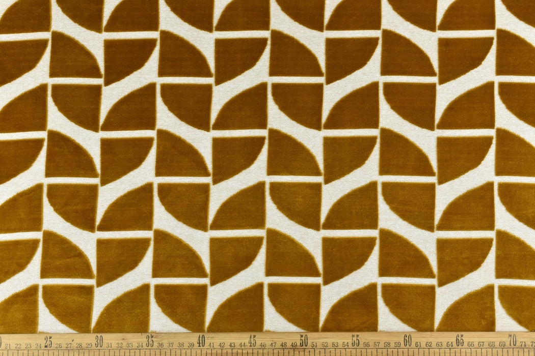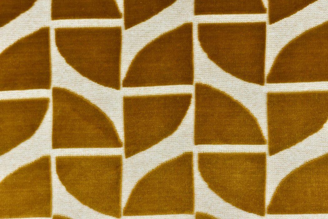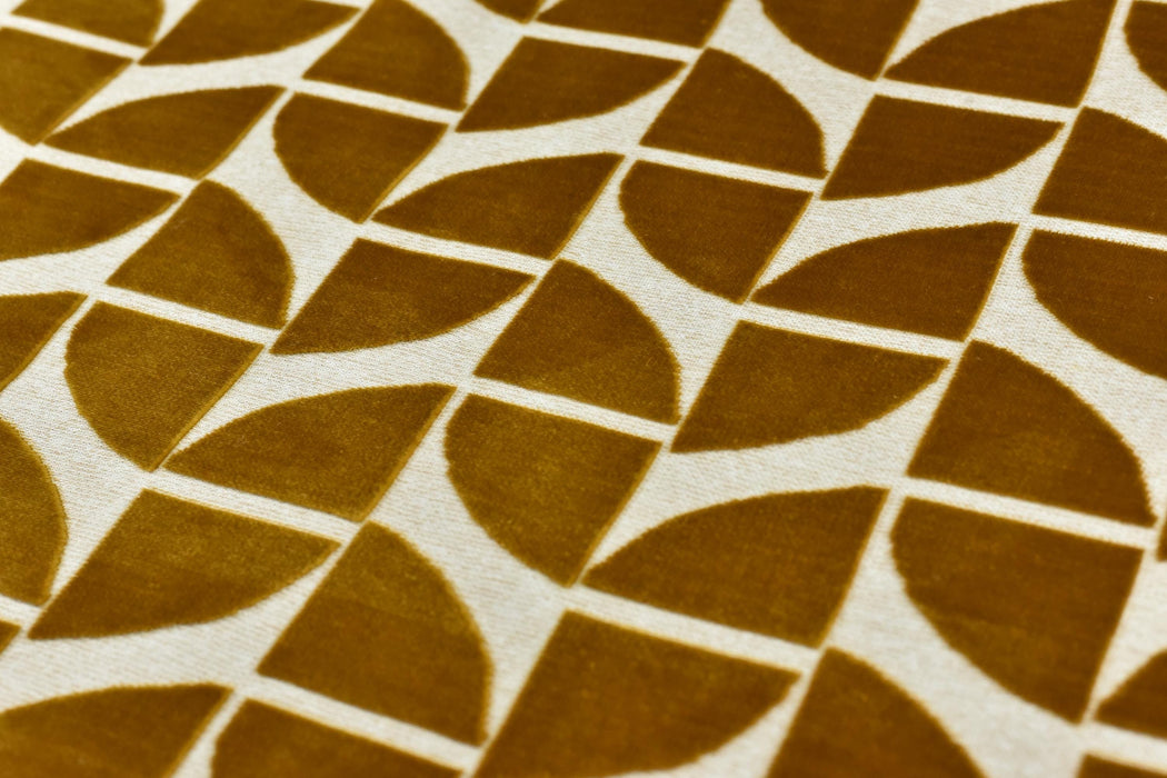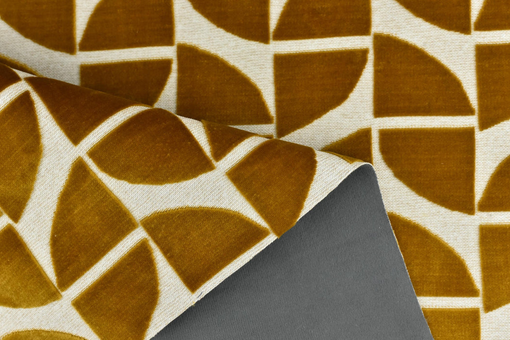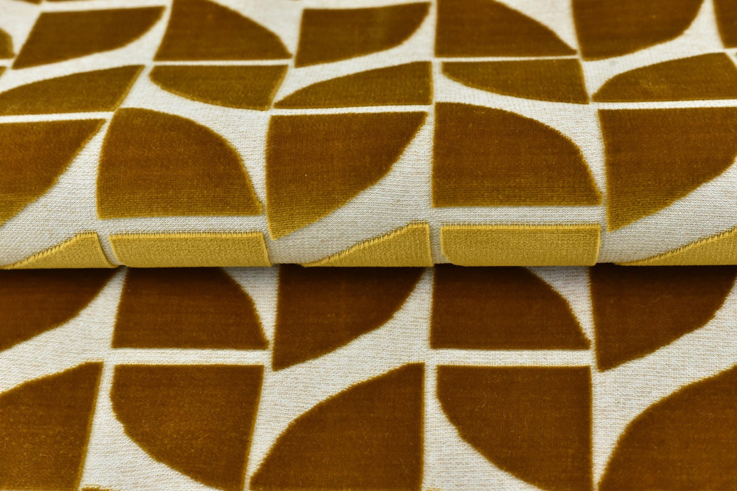 Elevate your furniture with this luxurious Gold Quarter Circles Geometric Cut Velvet Jacquard Upholstery Fabric. Perfect for chairs, sofas, or accent pieces, this heavy-weight fabric combines timeless elegance with modern geometric design. The rich burnt orange hue is complemented by intricate quarter-circle patterns, creating a bold yet sophisticated statement for any space.