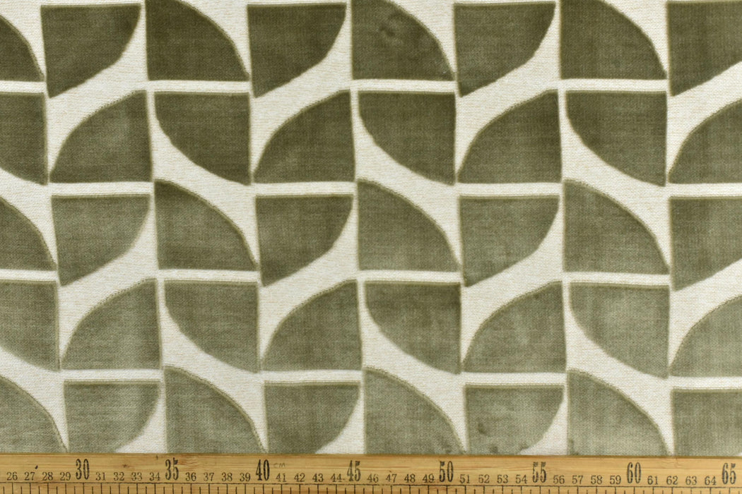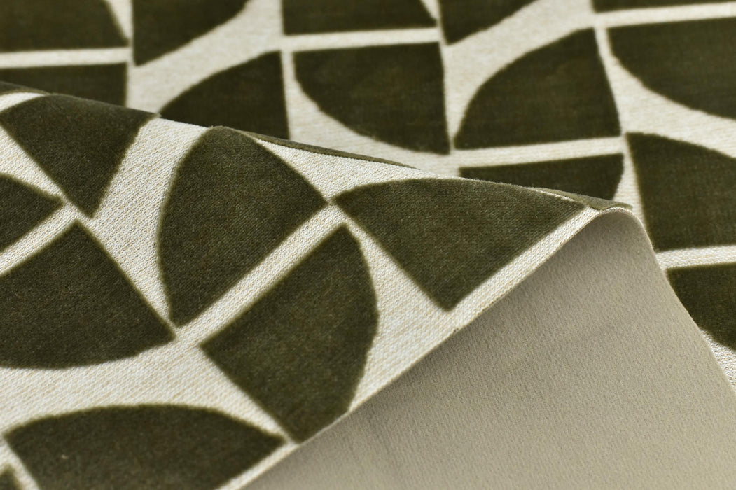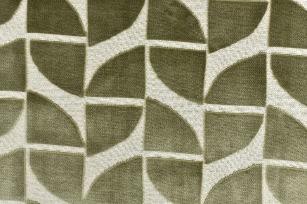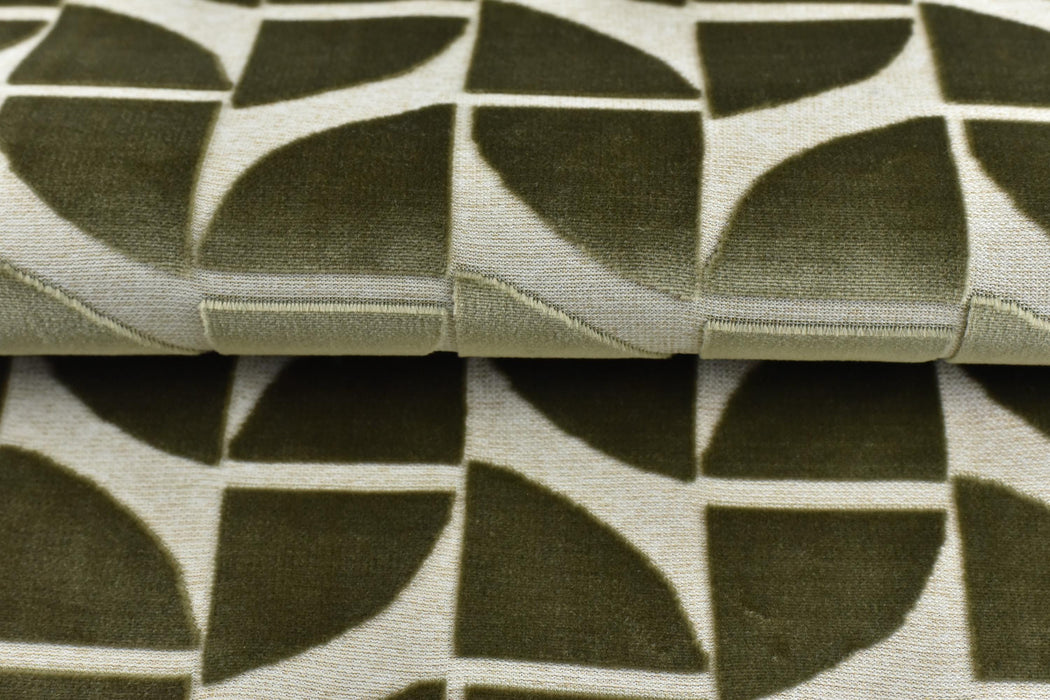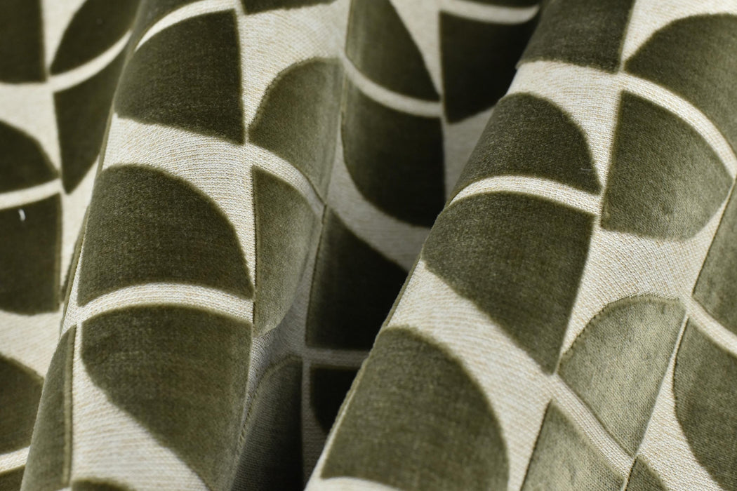 Elevate your furniture with this luxurious Light Olive Green Quarter Circles Geometric Cut Velvet Jacquard Upholstery Fabric. Perfect for chairs, sofas, or accent pieces, this heavy-weight fabric combines timeless elegance with modern geometric design. The rich burnt orange hue is complemented by intricate quarter-circle patterns, creating a bold yet sophisticated statement for any space.