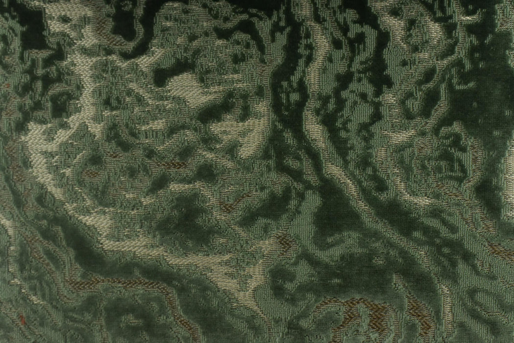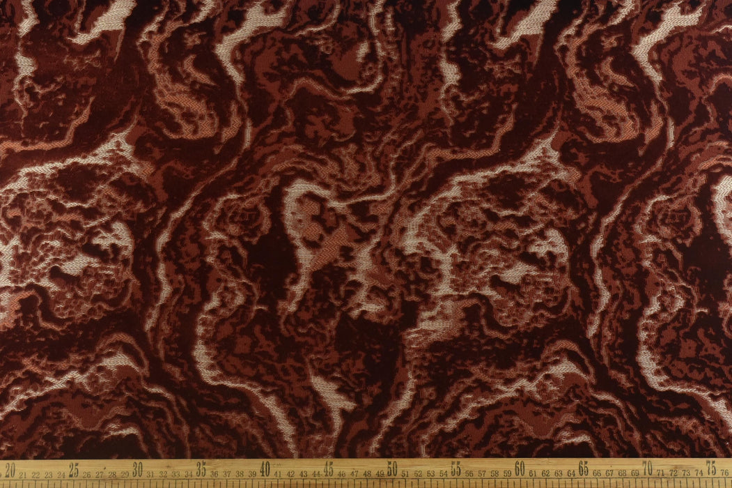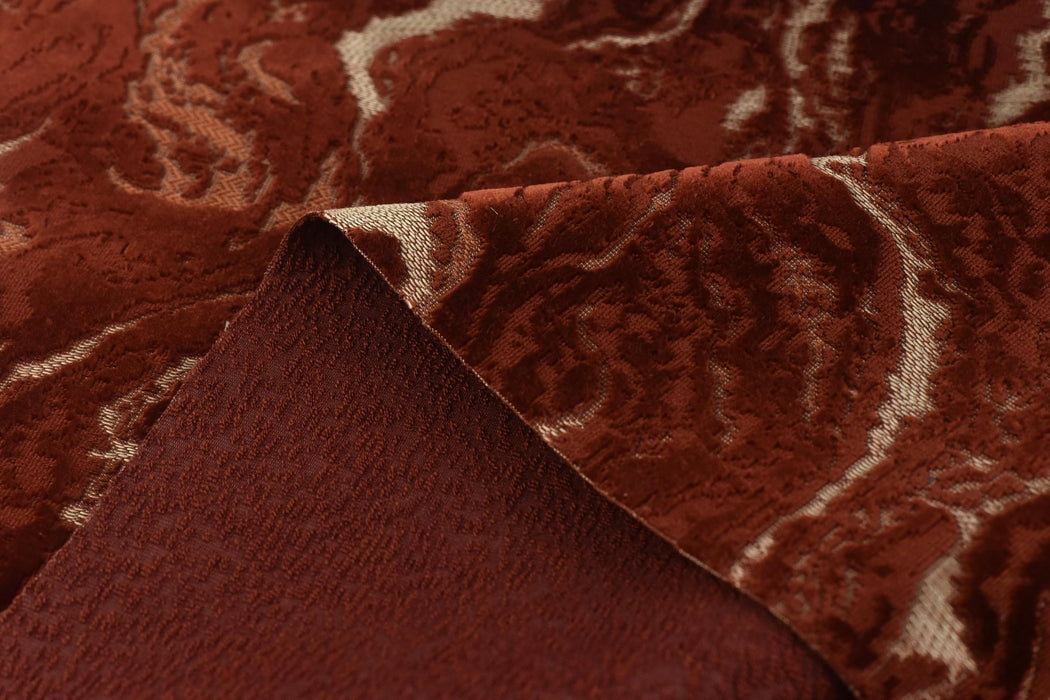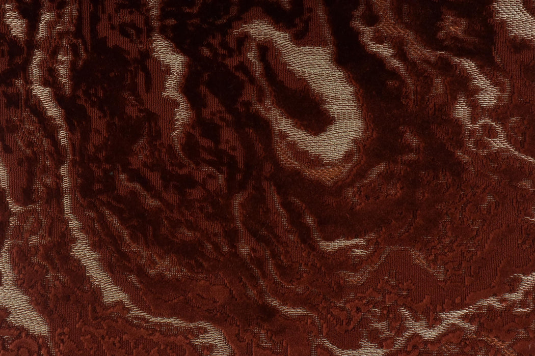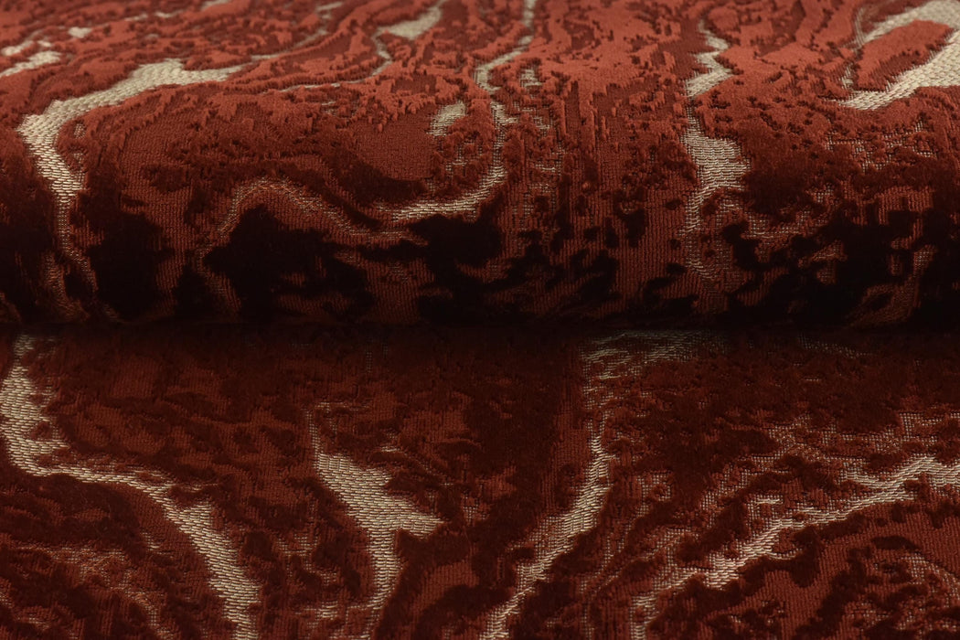A sample is worth a thousand words! Elevate your space with dramatic texture using this opulent burnt orange, red, and beige/green 3D cut velvet. Featuring a bold abstract geometric pattern with raised detailing, this heavyweight velvet brings art gallery sophistication to functional furniture.