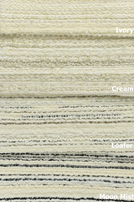 Elevate your interiors with our premium Wool-Linen-Cotton Blend Bouclé Fabric in a timeless ivory and cream stripe. This ultra-soft yet durable textured fabric brings understated elegance to modern furniture with its sophisticated nubby bouclé weave and subtle tonal striping.
