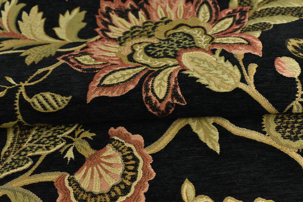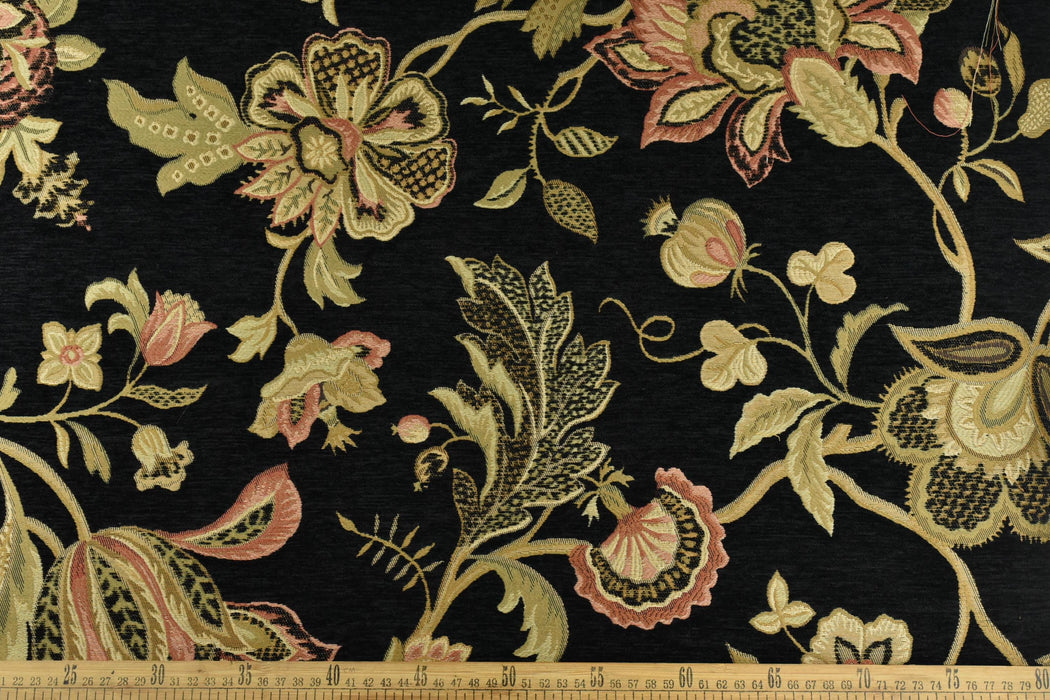 Elevate your home decor with this stunning Vintage Gold Pink Floral Jacquard Fabric, perfect for adding a touch of timeless elegance to your space. Inspired by mid-century modern design, this heavy-weight fabric features a luxurious blend of gold, pink and black floral motifs, intricately woven into a durable jacquard weave.