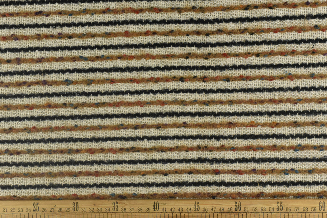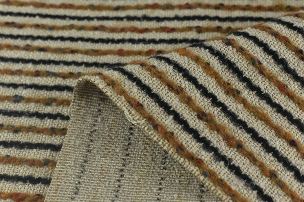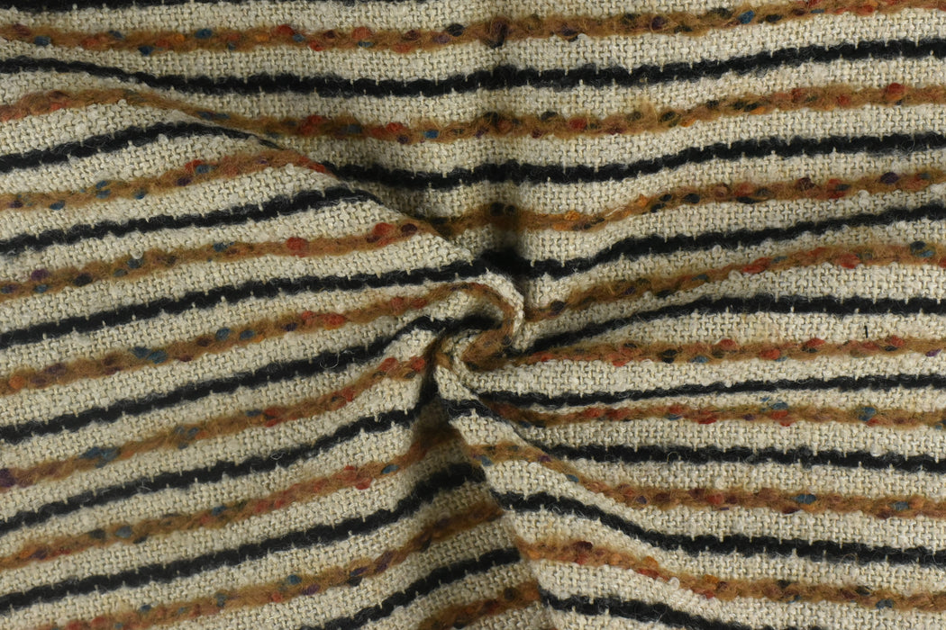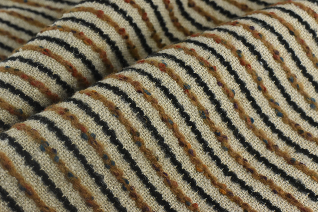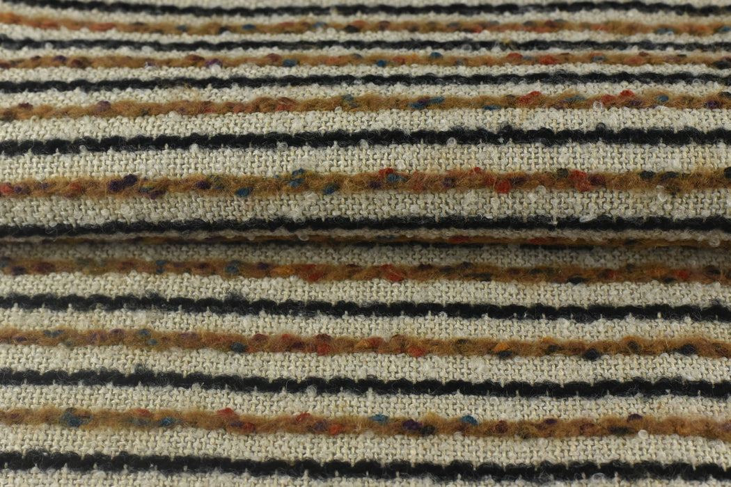 Bring bold texture and playful color to your home with our luxurious multi-colored striped bouclé fabric! This heavyweight wool-cotton-linen blend features a delightfully nubby texture and vibrant stripes, perfect for adding a pop of personality to chairs, pillows, and statement furniture pieces. Ready to transform your space? Add this eye-catching bouclé fabric to your cart today and sew something extraordinary!