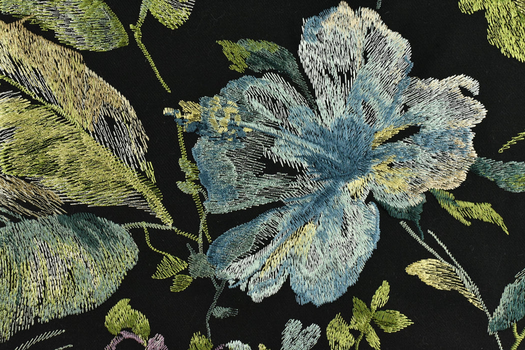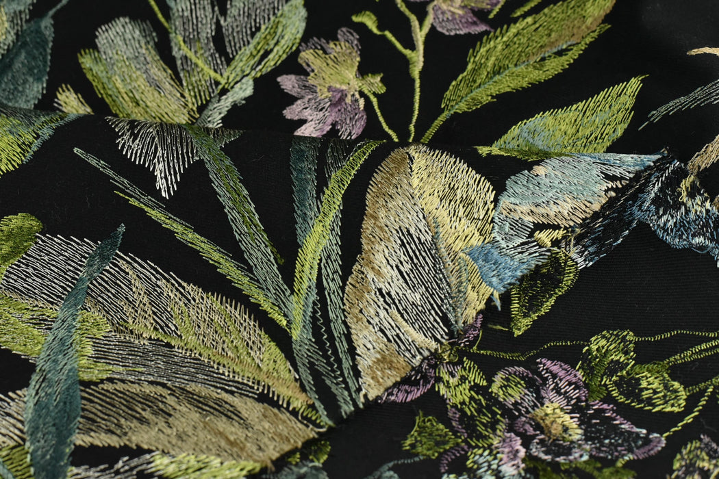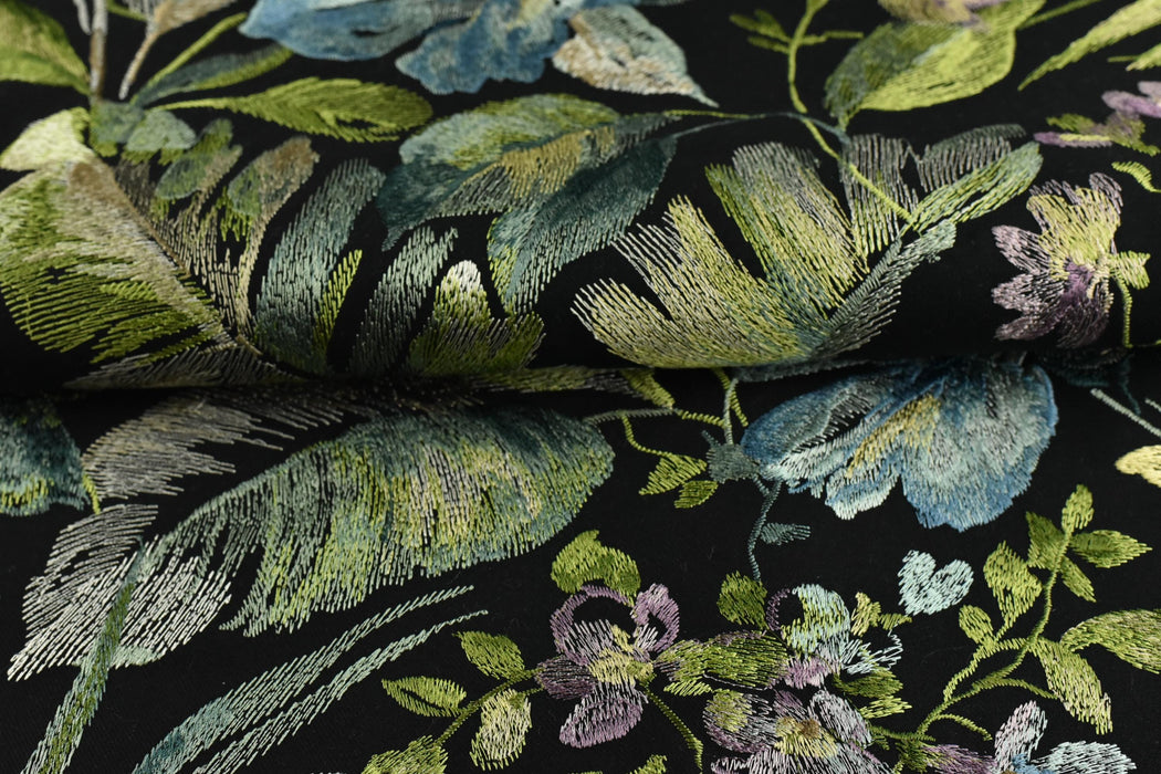 Elevate your home decor and creative projects with our Luxury Multi-Color Embroidered Botanical Floral Fabric. This stunning fabric features a harmonious blend of rich black, vibrant green, soft pink, and serene blue tones, adorned with intricate botanical floral embroidery. Perfect for adding a touch of elegance and artistry to any space or design.