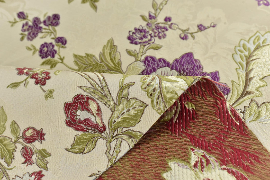 A sample is worth a thousand words! Recommend purchase a sample swatch prior to placing yards/meters.Make a bold vintage statement with this extra-wide jacquard brocade, featuring oversized red and purple florals on a textured ground. Perfect for recreating that 1960s grandeur, this heavyweight fabric brings dramatic scale to large projects without visible seams.