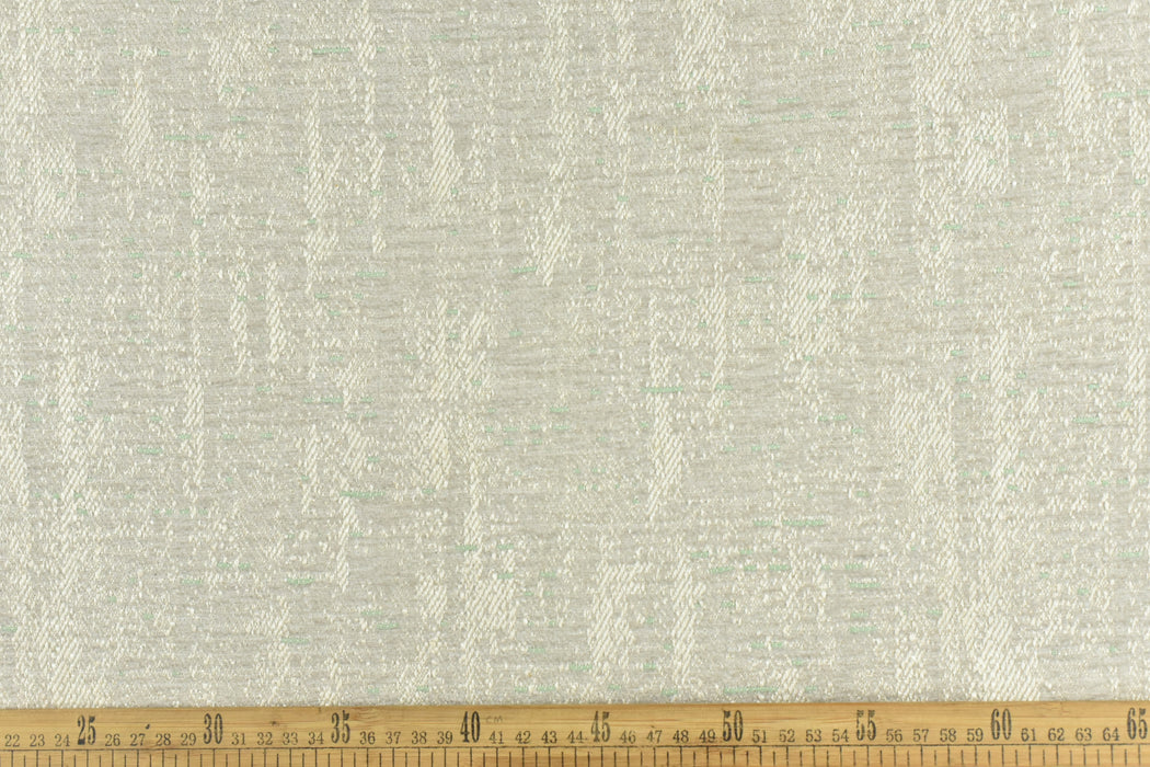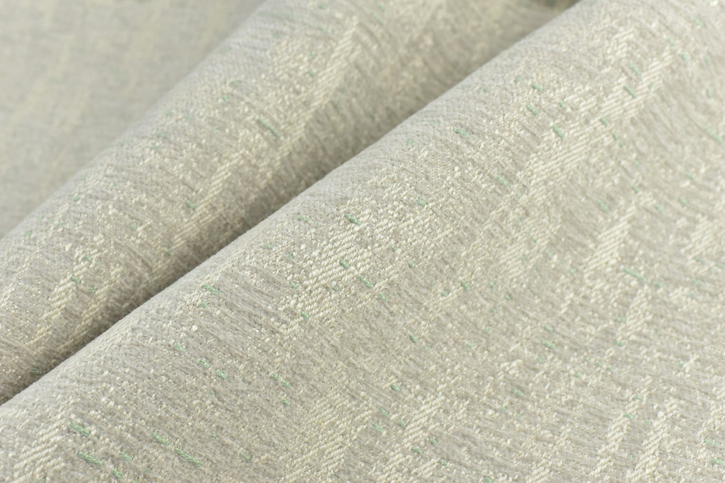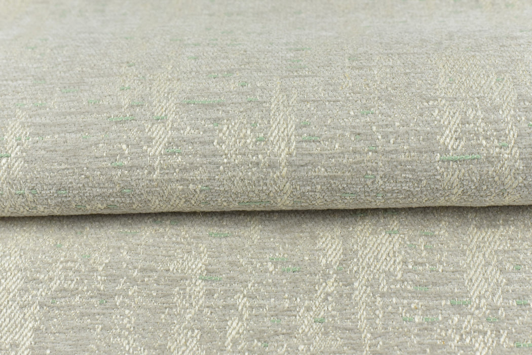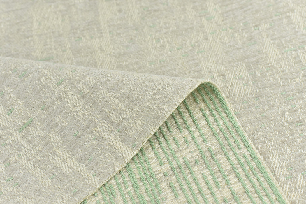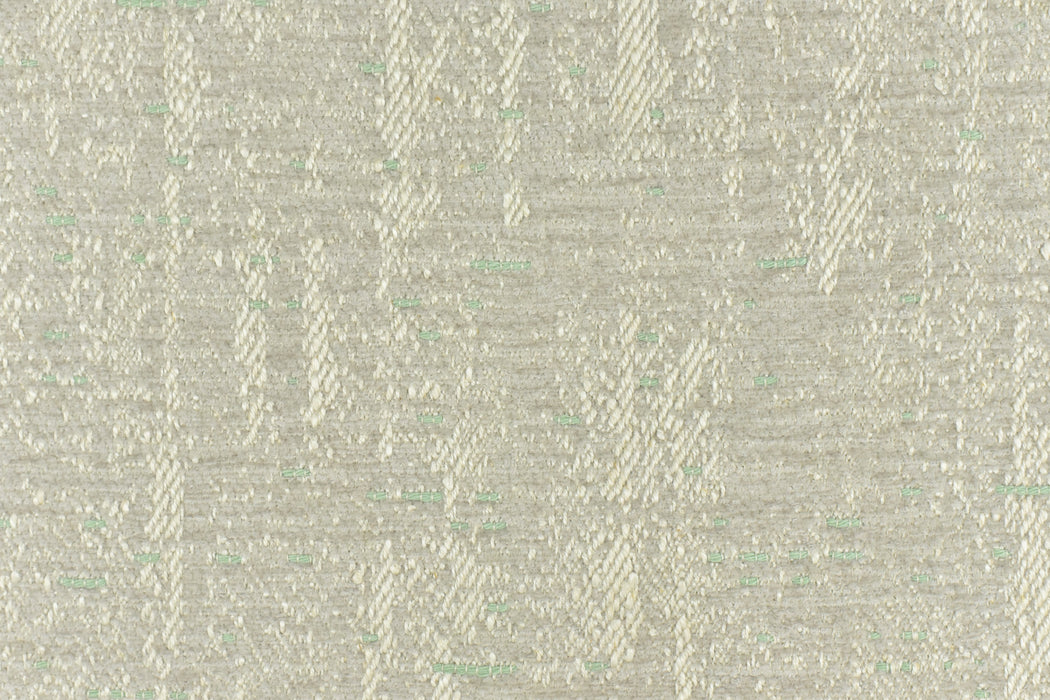 This is a cotton linen with polyester mixed durable and heavy fabric for upholstery in indoor spaces. The resulting pattern, when woven, is a deep, textural design that undulates via different yarns. it has a subtle green mixed in a cream sand background and giving it a playful and texture.